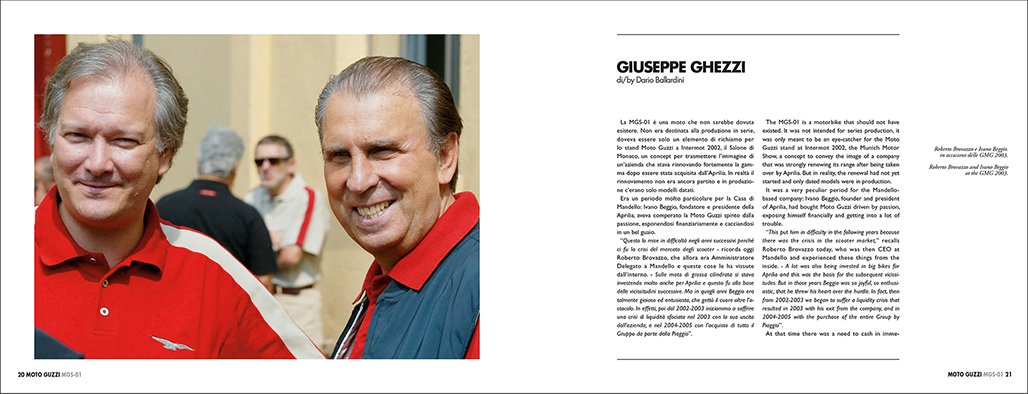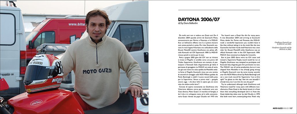 Thanks to the collaboration of numerous authors, the book features testimonies from Bruno Saturno, owner of Ghezzi-Brian, the company that developed the prototype, Giuseppe Ghezzi, its designer, Roberto Brovazzo, who was the CEO of Moto Guzzi at the time, and Gianfranco Guareschi, who rode this motorcycle to victory at Daytona.
